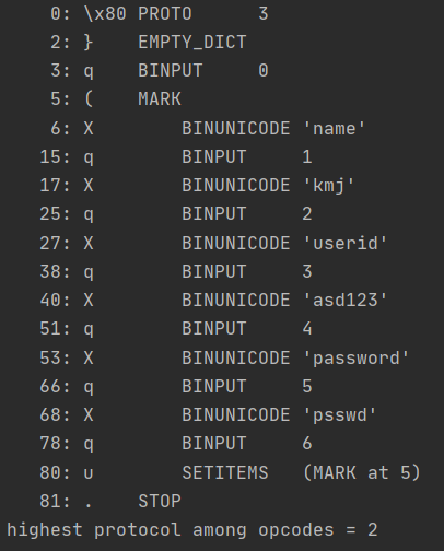 data라는 dictionary를 만들고 pickle 모듈을 이용해 직렬화를 한 뒤 알아보기 쉽게 pickletools를 이용했다.